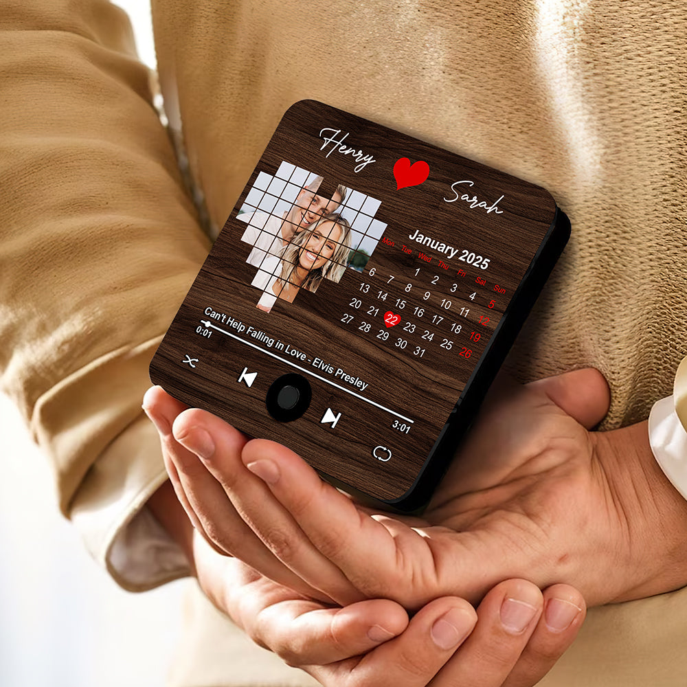 Celebrate your love with our custom fridge magnet featuring a personalized calendar, a photo of you and your partner, and an iconic love song like 'Can't Help Falling in Love' by Elvis Presley. This unique gift is perfect for anniversaries, Valentine's Day, or any special occasion, and is designed to bring joy to both the giver and the receiver. Make every moment special with a blend of cherished memories and pop culture!